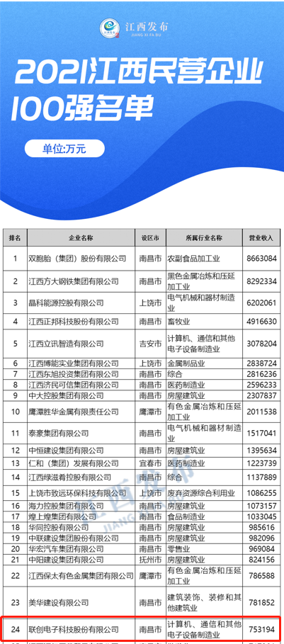 1213日,2021江西民营企业100强、2021江西制造业民营企业100强、2021江西服务业民营企业20强榜单发布,stake电子以强大的综合实力和稳健的发展态势,连续第九年荣登榜单其中,在江西民营企业100强中位列第24,较前一年位次前进3位,在江西制造业民营企业100强中位列第13位。